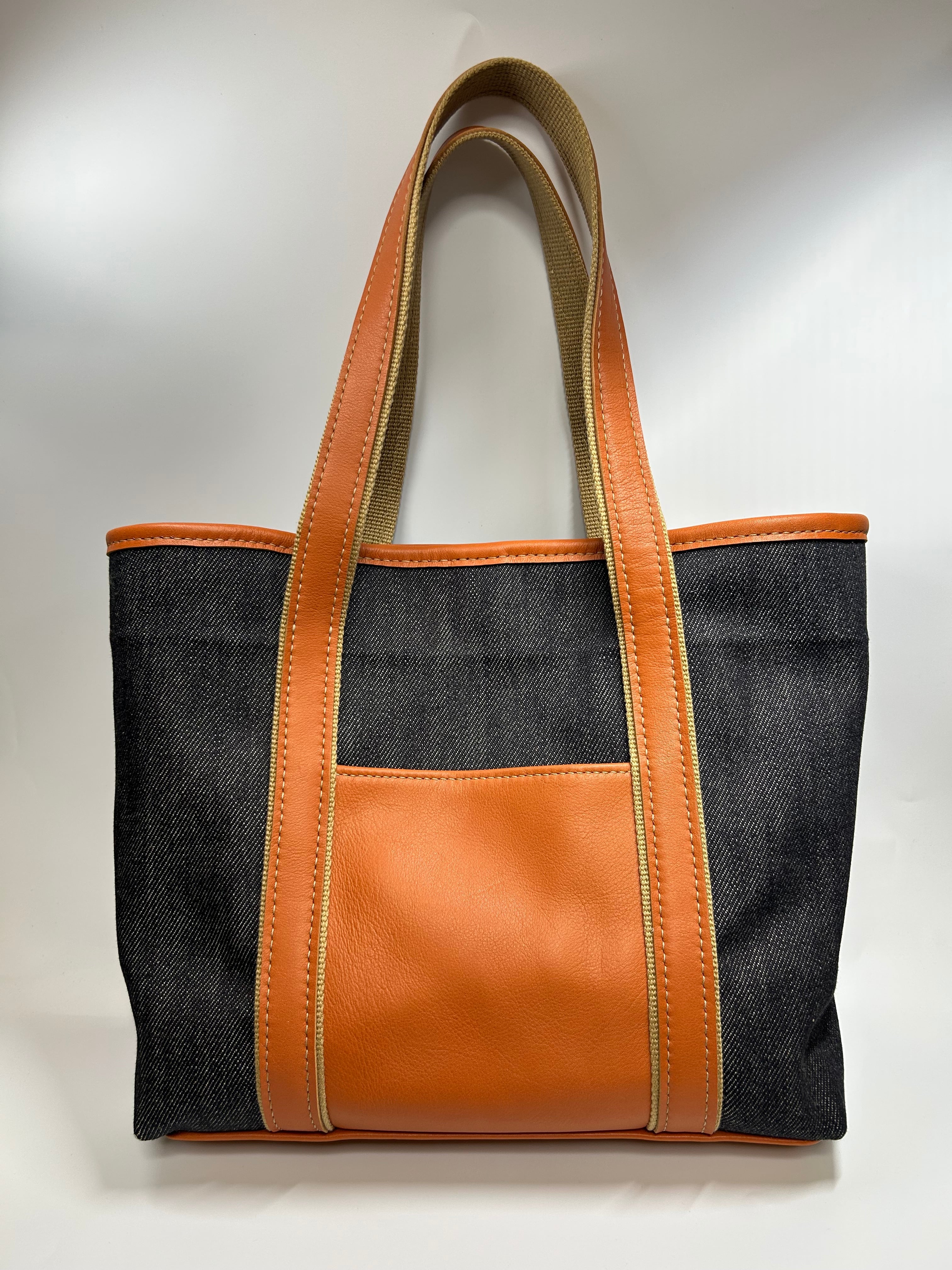 手作業で丁寧に仕上げられたトートバッグ(デニムと革のコラボ、ポイントに手花織)。デニムの質感とオレンジ茶色の革が絶妙に組み合わさり、手花織が施されたポイントがスタイリッシュな印象を与えます!内側には革に合わせた色のインナー生地が使われており、インナーの両サイドに便利なポケットと金具が2箇所付いていて、小物をしっかり収納できる実用性も兼ね備えています。